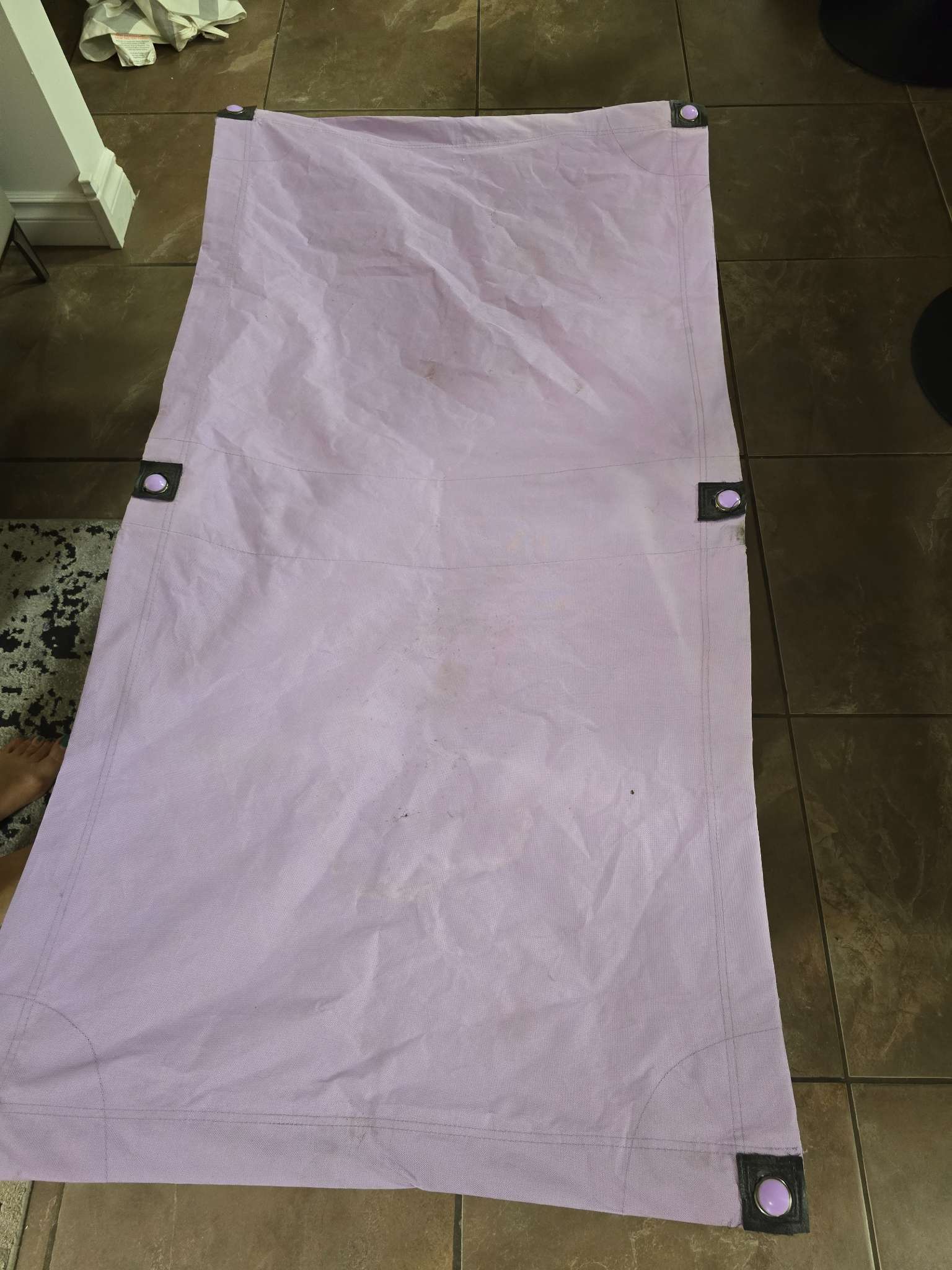 Description : Toddler Instant Standard Portable Folding Camping Cot Bed purple color 52" x 25" x H 14" Easy-fold frame system, it sets up quickly and provides a sturdy base that allows you to rest off the ground, keeping you away from uneven surfaces and damp conditions. Ideal for campers who want to maximize space, the cot frees up storage beneath it, making your camping area more organized. NOTE: has some stains. typical of camping. Check pictures