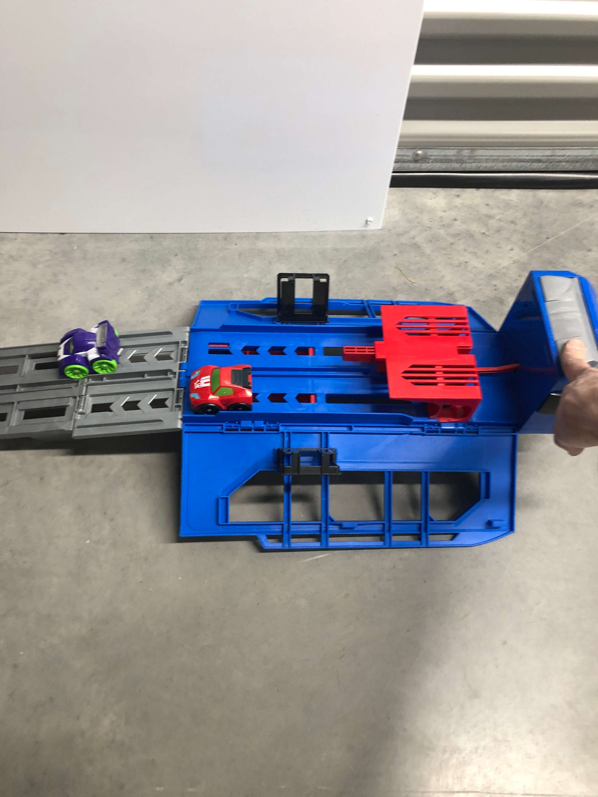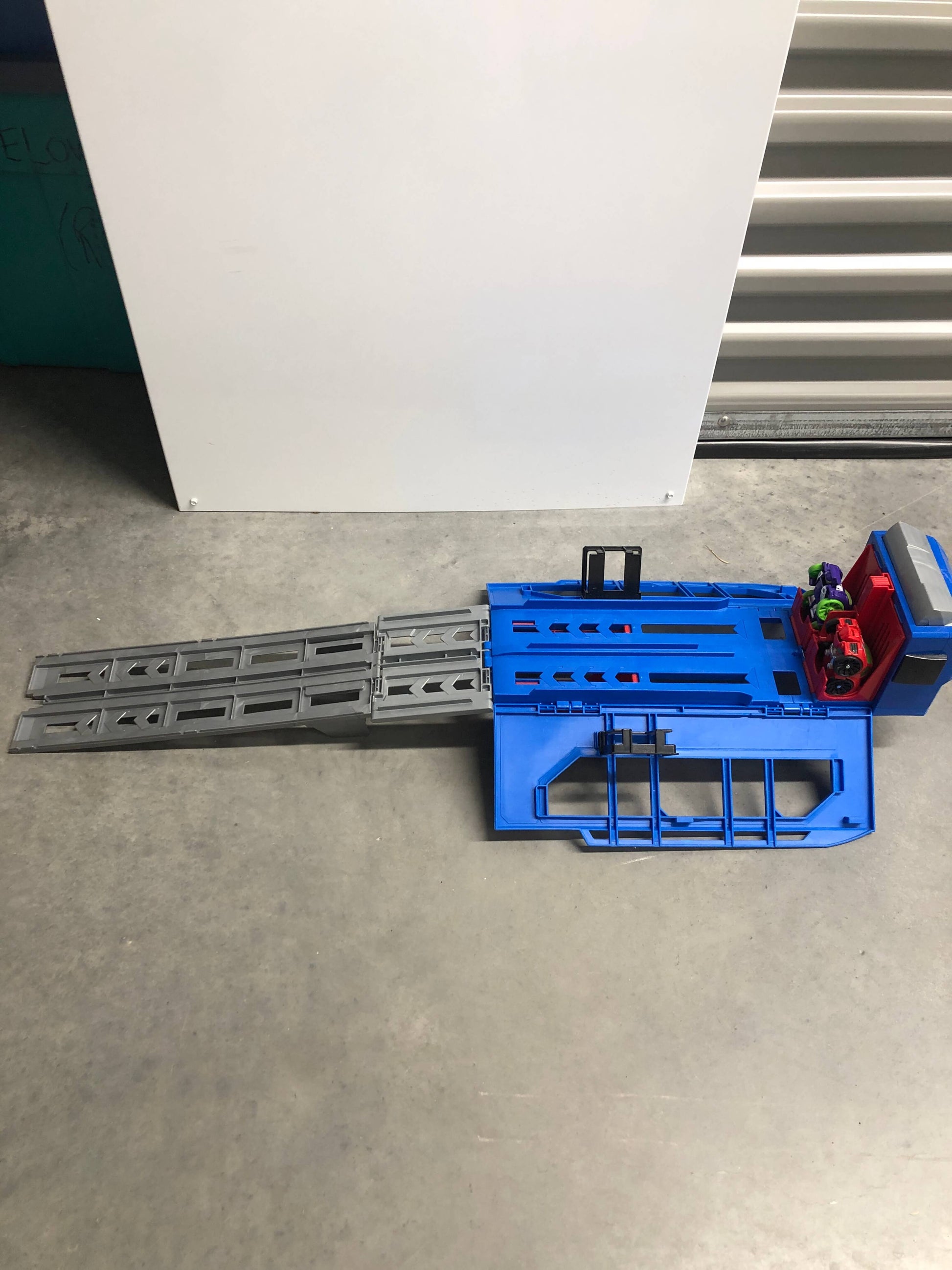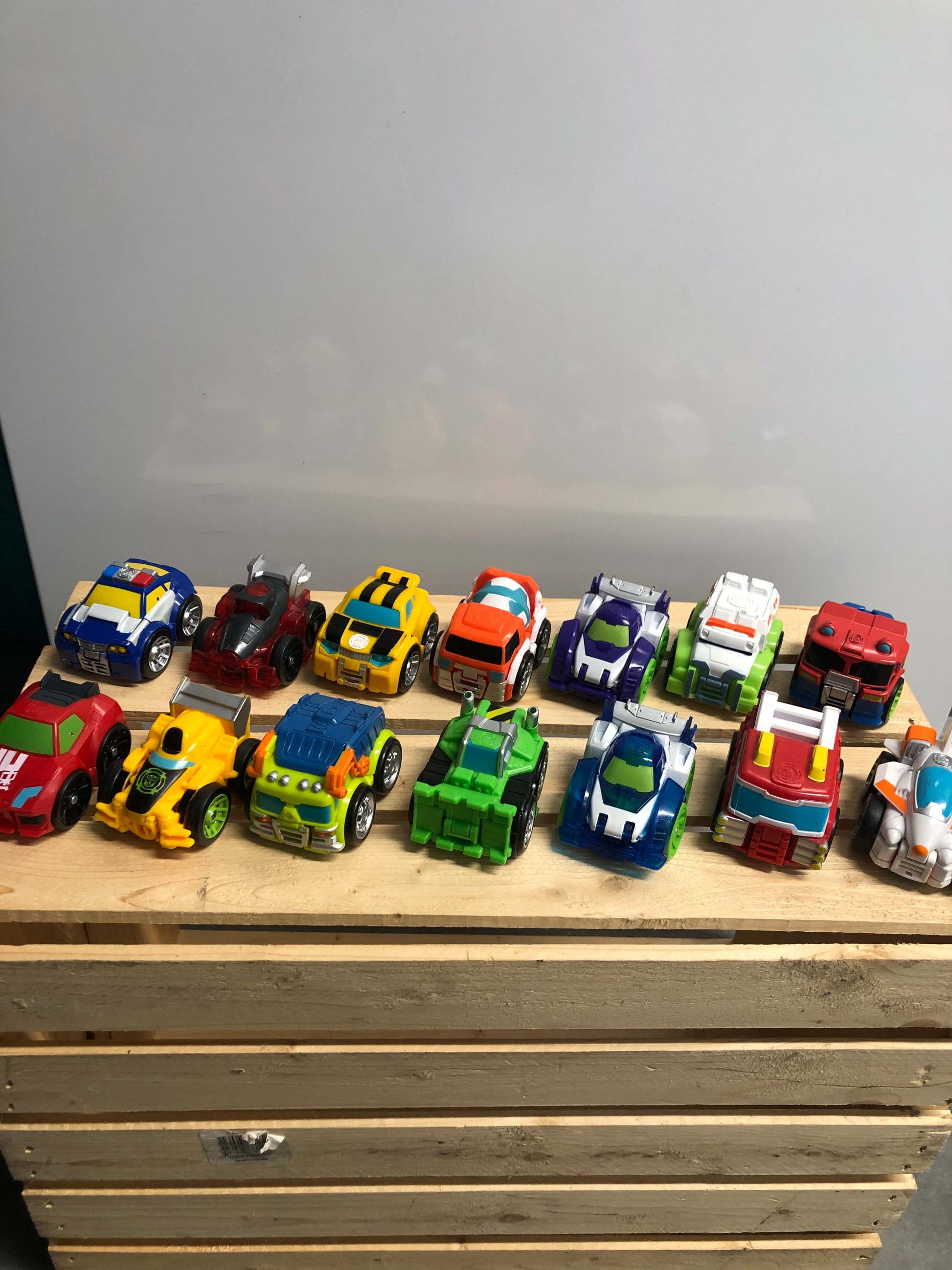 Description : Flip Racers (14), launchers (2) and tracks (2) XL Optimus Prime with Flip Racer trailer/launch ramp Rescue Bot Transformers (18) Standing Bumblebee Large Optimus Prime Transformer (some scuffs pictured) Large Blades Transformer (some scuffs pictured) Fire hall with Cody (hands are fairly scuffed) and accessories Large Hightide with small Hightide and accessories Large light up/talking Hotshot Transformer dogs/tools (can be held by Rescue bots)