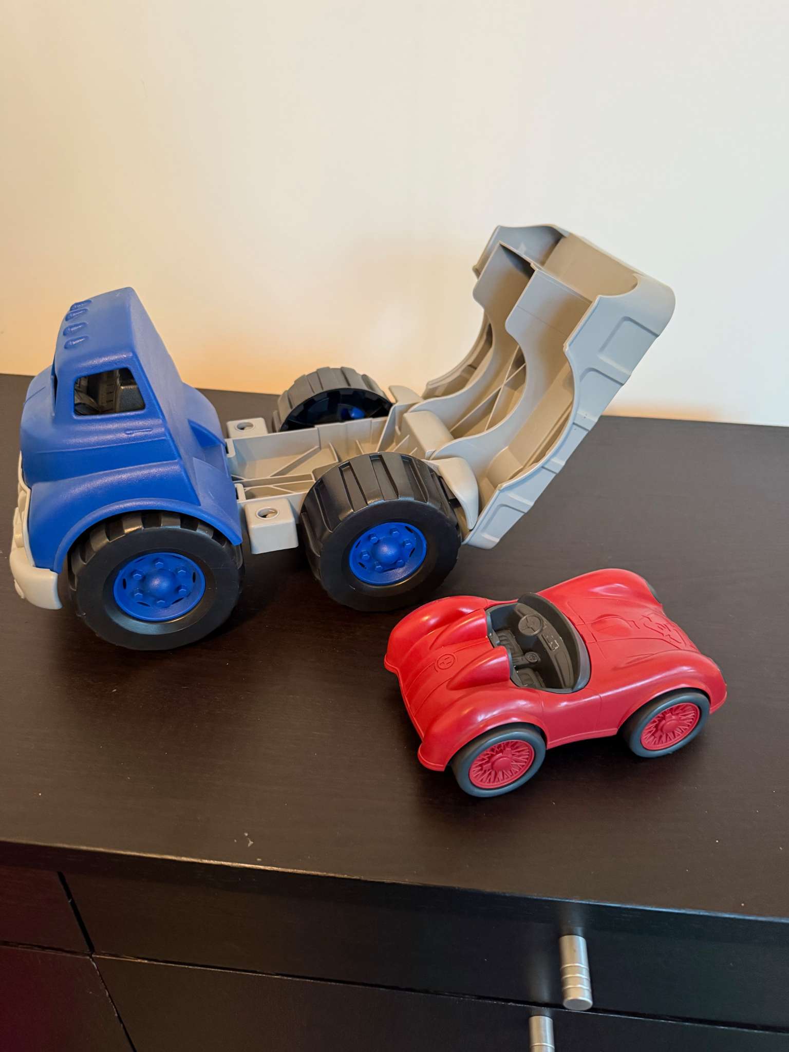 Description : Flatbed Truck with Car. Excellent condition baby toy by GreenToys. Safe simple fun. New one costs $34 Made from 100% recycled plastic No BPA, phthalates or PVC Meets FDA food contact standards Easy to clean and dishwasher safe