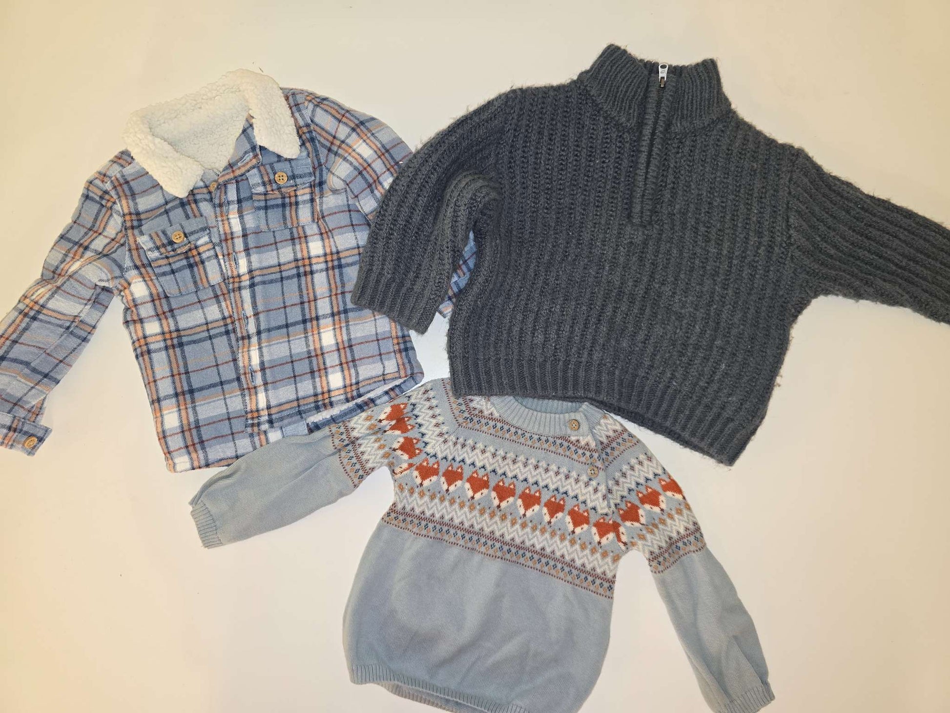 Description : Bundle Includes: - TU Baby Jacket FLEECE FROM INSIDE - TU Baby Sweater - Zara Dark Blue Sweater with Pull-up Zipper ( Please see pictures, some curling)