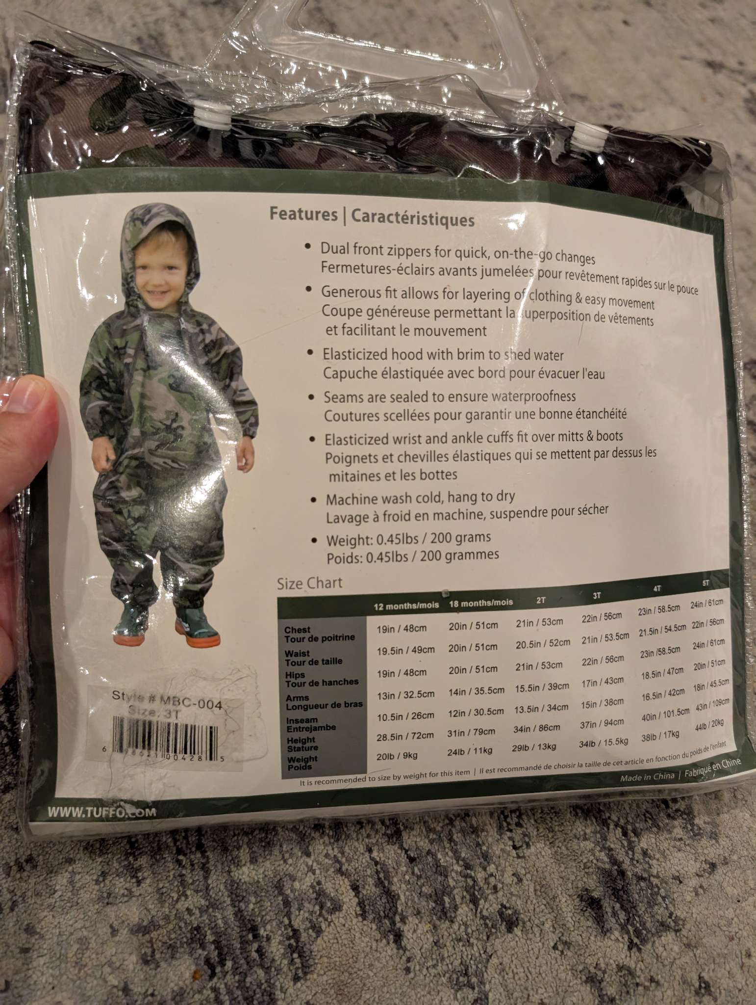 Tuffo Muddy Buddy - 3T, camo, NEW in package, Kids 3T