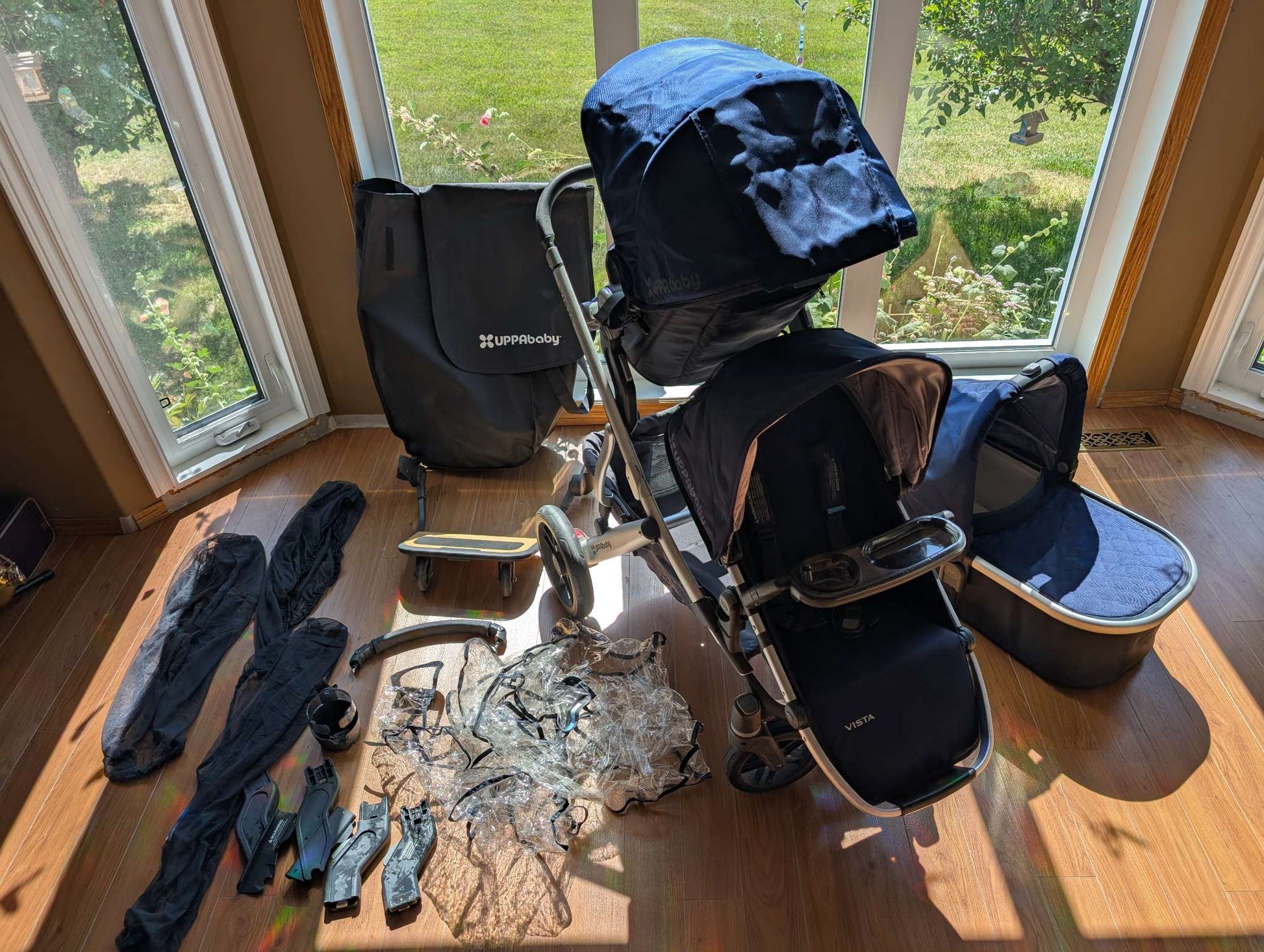Description : Uppababy Vista V2 Stroller – Complete Package (Taylor – Navy Blue) Selling our Uppababy Vista V2 stroller set in the Taylor (navy blue) colorway, one of the most versatile and best-selling strollers on the market. This package includes everything you need from newborn through toddler years and beyond. What’s Included: Vista V2 Stroller Bassinet RumbleSeat (for second child seating) Snack Tray Cup Holder PiggyBack Ride-Along Board Lower Adapters Upper Adapters Rain Shields & Bug Shields included Condition: Overall in very good condition with many years of use left. Minor wear: small hole on the sunshade of the upper seat and some wear on the basket mesh (replacement basket fabric available from Uppababy for ~$40). Retail Value: Vista stroller: $1,500 RumbleSeat: $390 PiggyBack board: $190 Snack tray: $70 Cup holder: $40 Lower adapters: $45 Upper adapters: $45 ➡️ Total Retail: Over $2,200 This is the ultimate stroller system for growing families, offering premium quality, smooth maneuverability, and the flexibility to carry one, two, or even three kids at once.