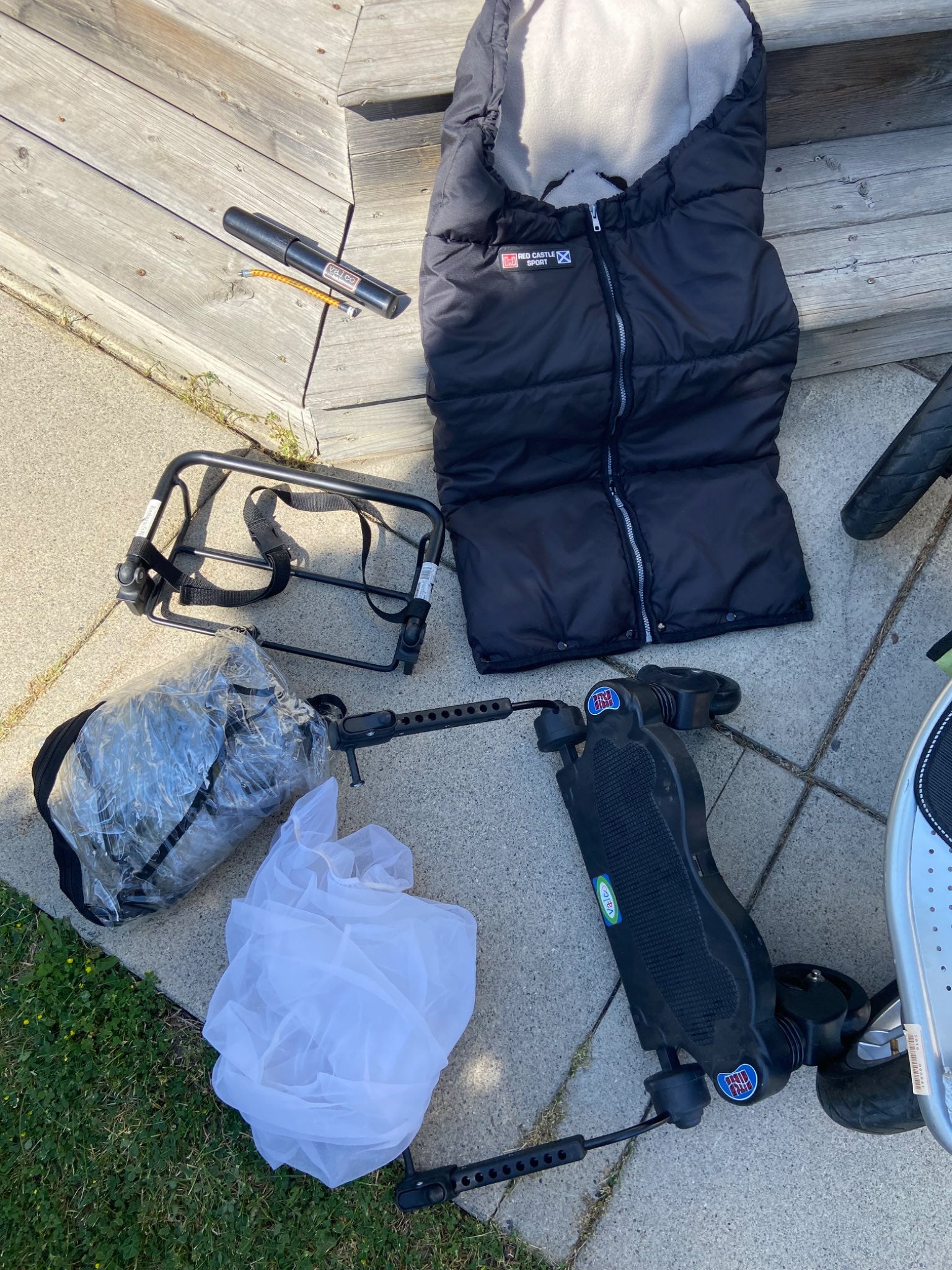 Description : Older model Valco Baby Runabout Tri-mode Jogging Stroller in Pistacho colour with multiple accessories. In very good working condition, used for two kids but has tons of life left in it. Lays flat easily for napping and stroller has expandable hood for greater sun coverage. Front wheel can be locked, set to 45 degree swivel or full swivel. Comes with stroller sleeping bag, ride-on toddler attachment for the back, 3 covers (rain, mosquito and breathable blackout), snack tray with extra cup holder attachment, cup holder for mom, side clips for diaper bag, safety strap and attachment for Peg Perego infant car seat. Tire tubes replaced one year ago and can be purchased inexpensively from Amazon. Tire pump and original manual included. Does not have the infant “headhugger” shown in the manual pictures.