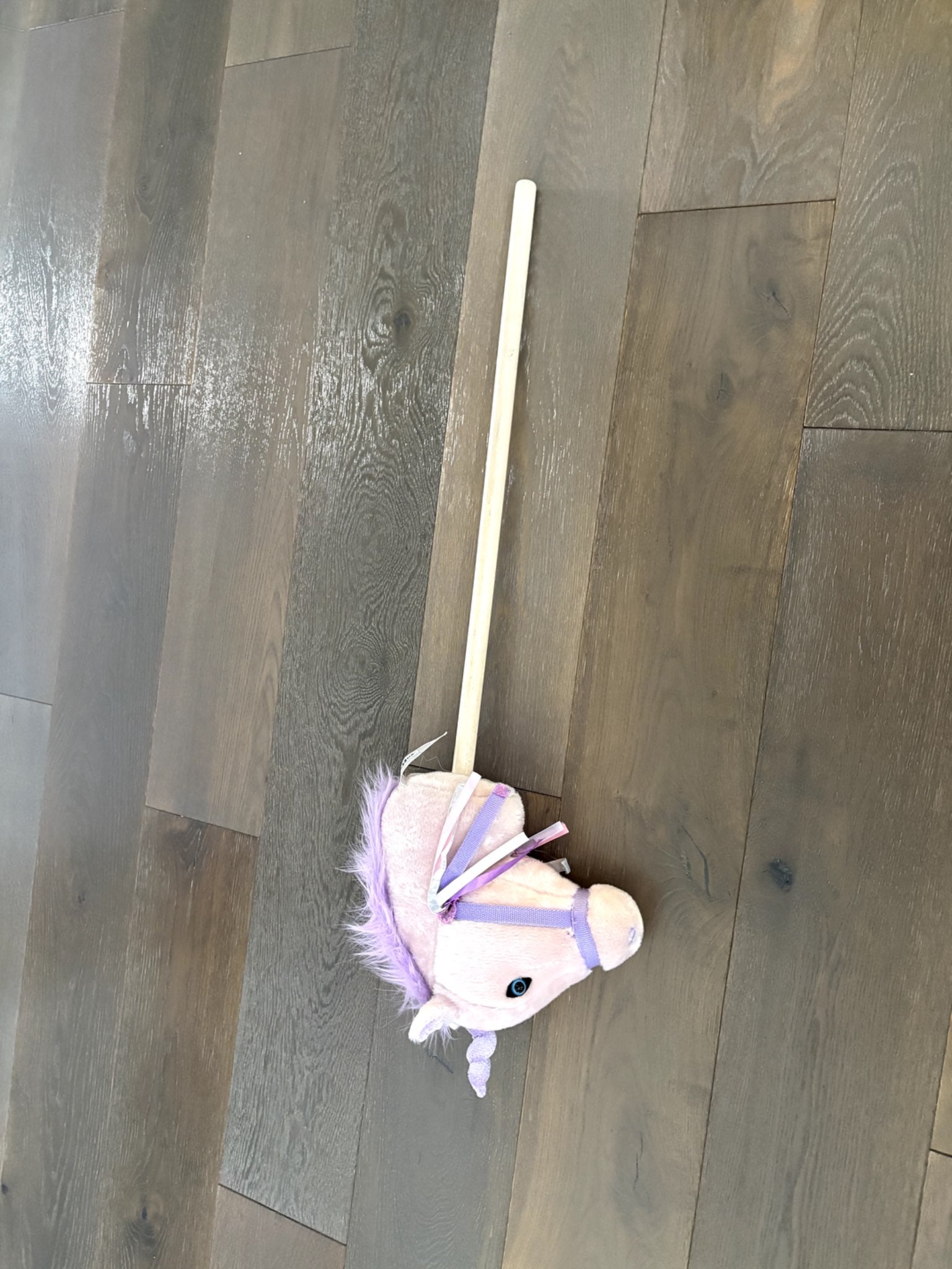 Description : Unicorn has a soft, white plush head with a glittering horn and ears. Pet your Unicorn's fluffy purple mane and hold onto the stick and ride off into the sunset! Press the ears for galloping and neighing sounds! Product dimensions: stick length approx. 34"cm (H)