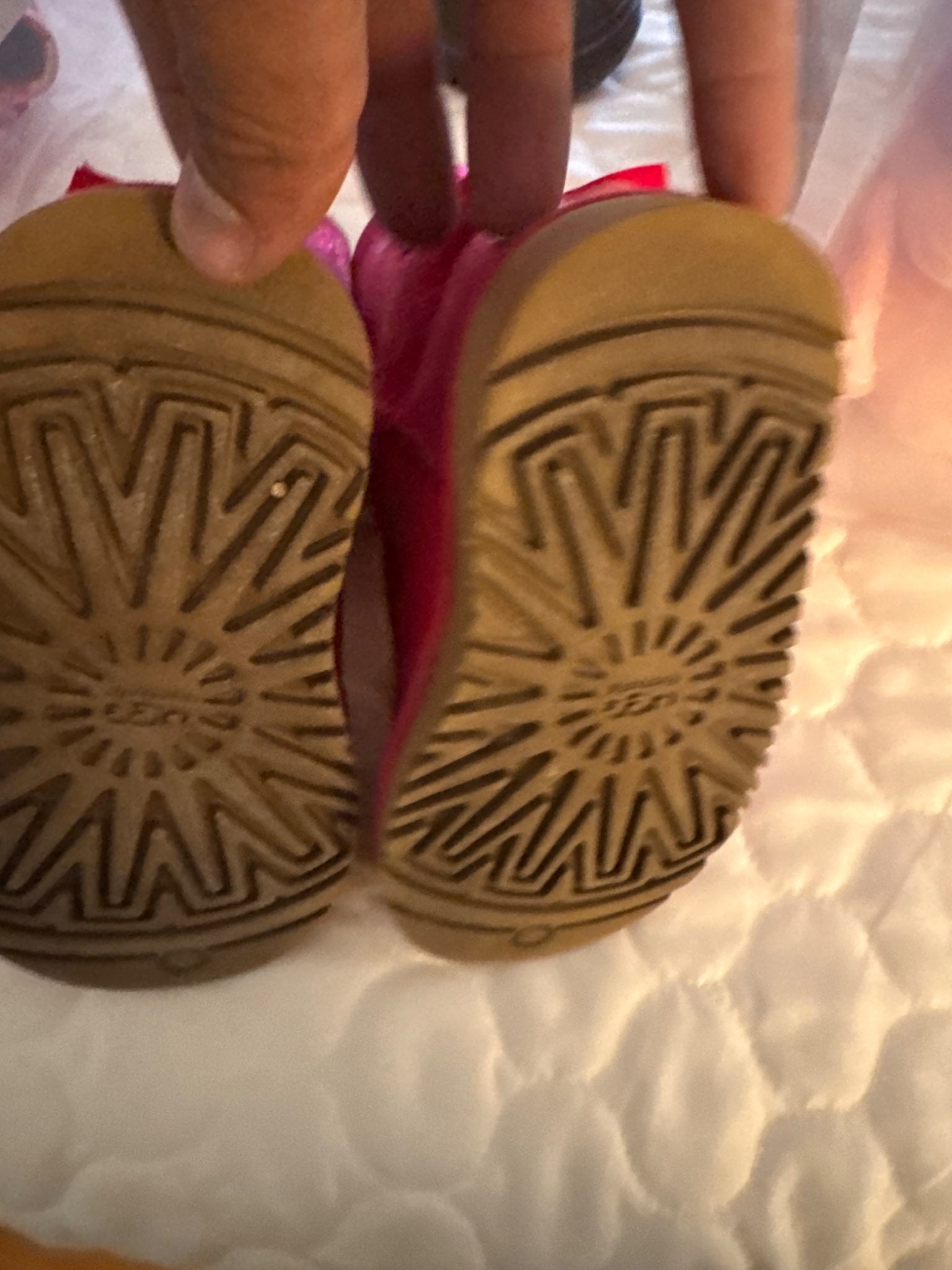 Description : VGUC UGG Pink Ribbon (Toddler Size 8 - FITS 7-7.5) Booties; Retails: $140.00. Some blue discoloration from wear/usage. Toddler size 8; however, due to the fur lining, I found it fit a half to a whole size smaller. Discolouration from use (blue hue) shown in photos.