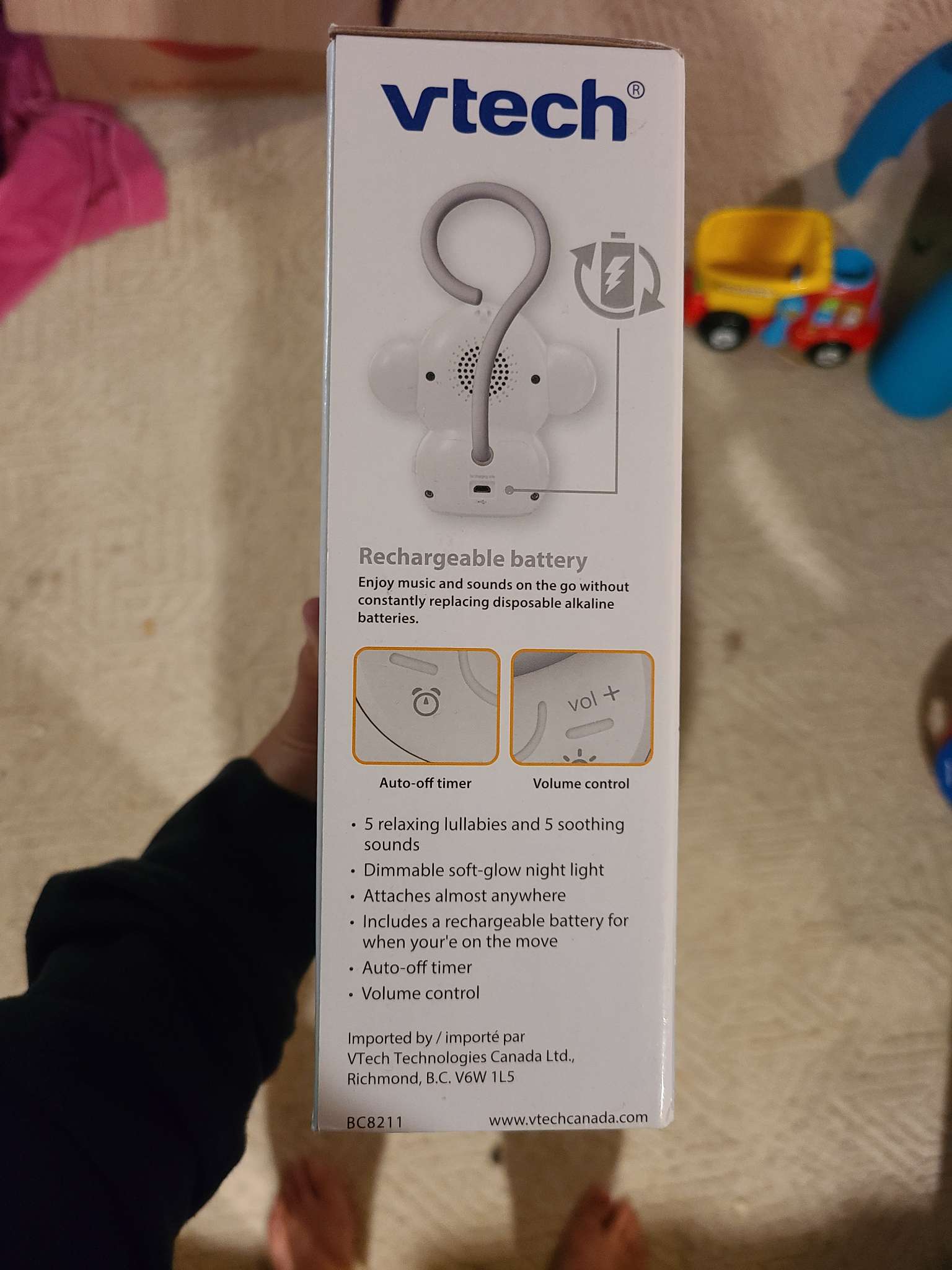 Description : Vtech safe and sound portable sound machine new.. has a light, 5 lullabies and 5 soothing sounds.. has a hook that you can hang it on things.. its new in the box never been opened or used