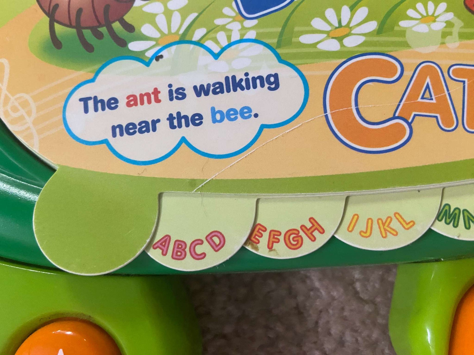 Description : Learn the alphabet with this touch & teach turtle. A few pages are scratched (see close up pictures) but everything works just fine.