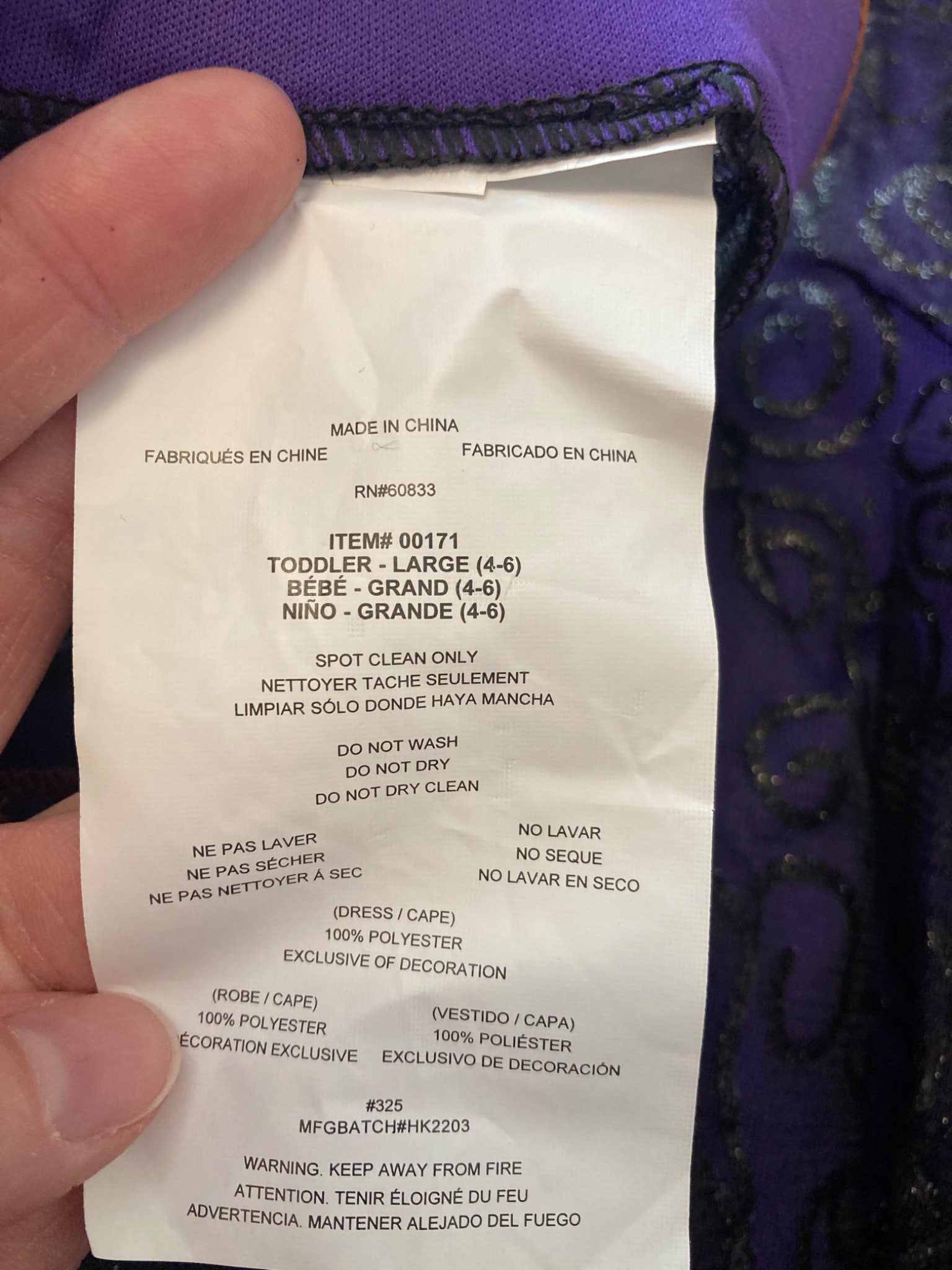 Description : 3 piece witch costume (dress, cape, hat). Stretch velvet top, stretch jersey underskirt with glitter tulle overlay.