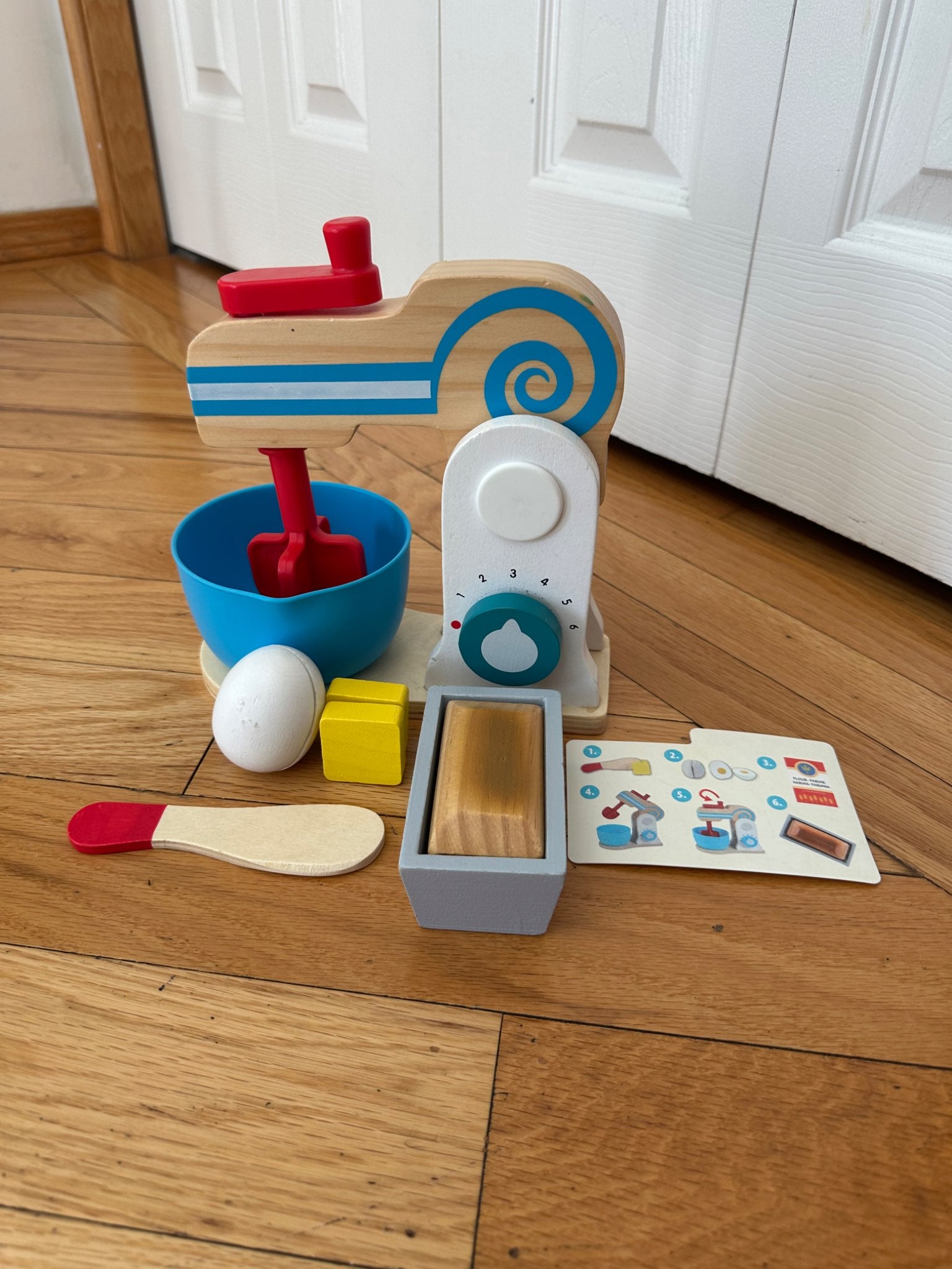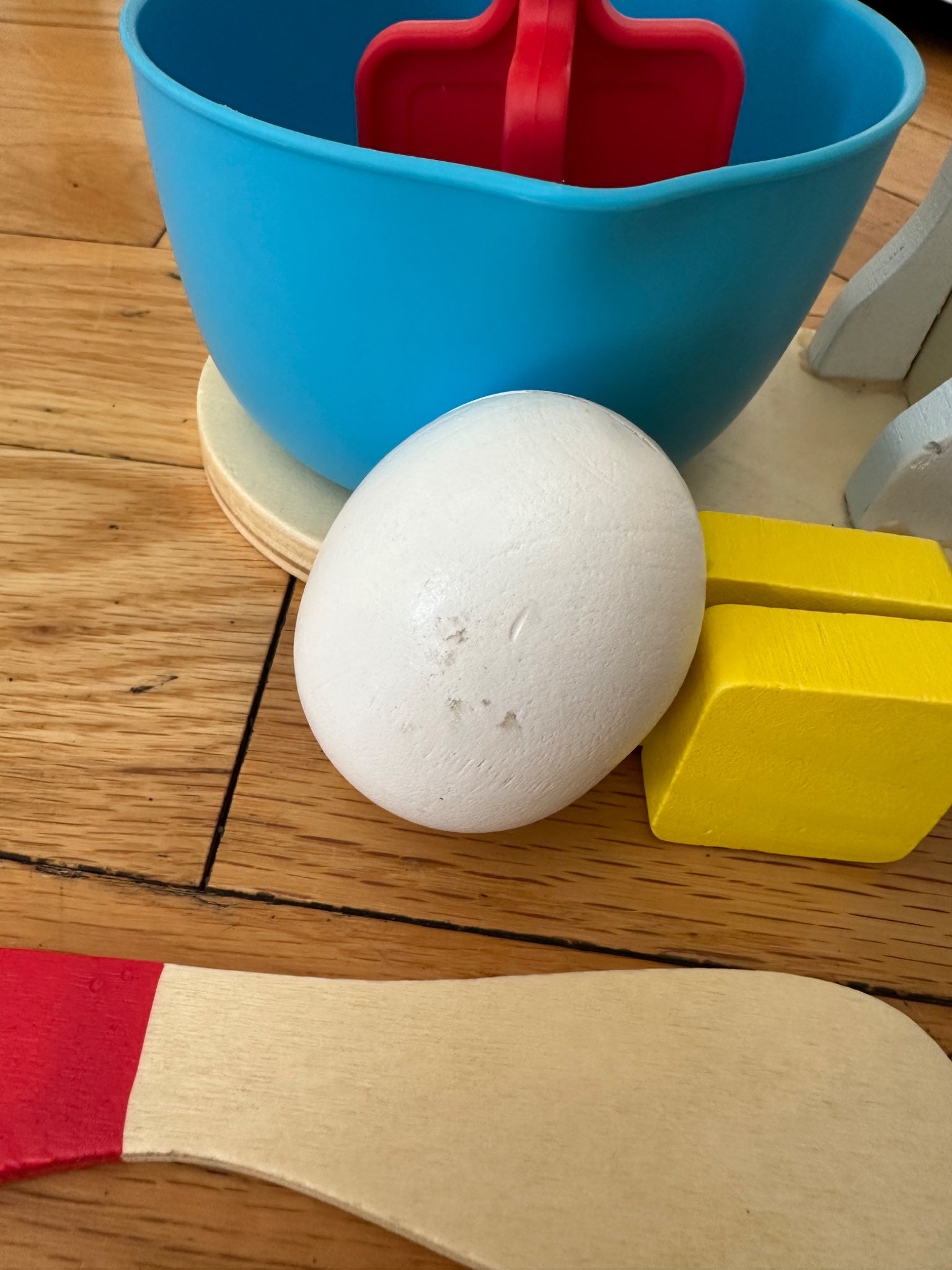 Description : 10 piece wooden hand-crank mixer set (mixer, bowl, sliceable wooden egg and butter, loaf, cake pan, pretend cake mix box (MISSING this box as it got wrecked with so much play), cake pan, wooden knife. Encourages creative thinking and imaginative play. In good condition, just has some minimal scuffs on the wood as seen in the picture on the egg.