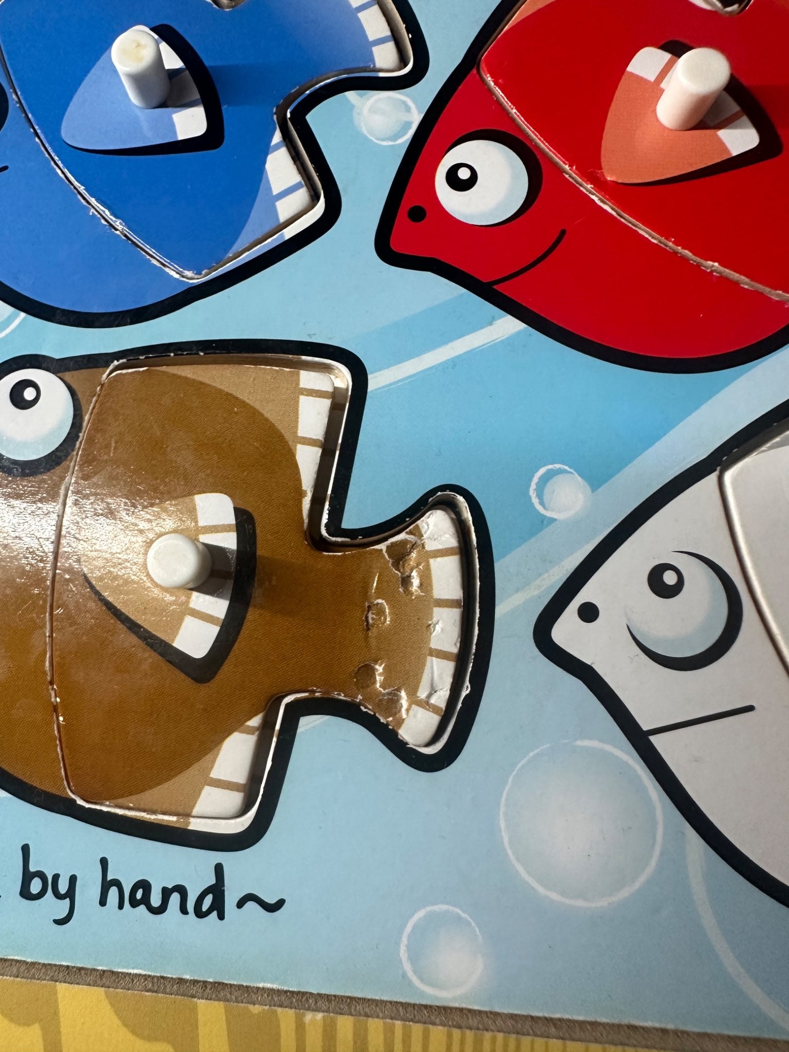 Description : No pieces missing 6 wooden puzzles in lot Some minor marks that can be seen in the pictures. One fish tail has teeth marks from my toddler. All puzzles fully functional and great for learning shapes, colours, mom and baby animals