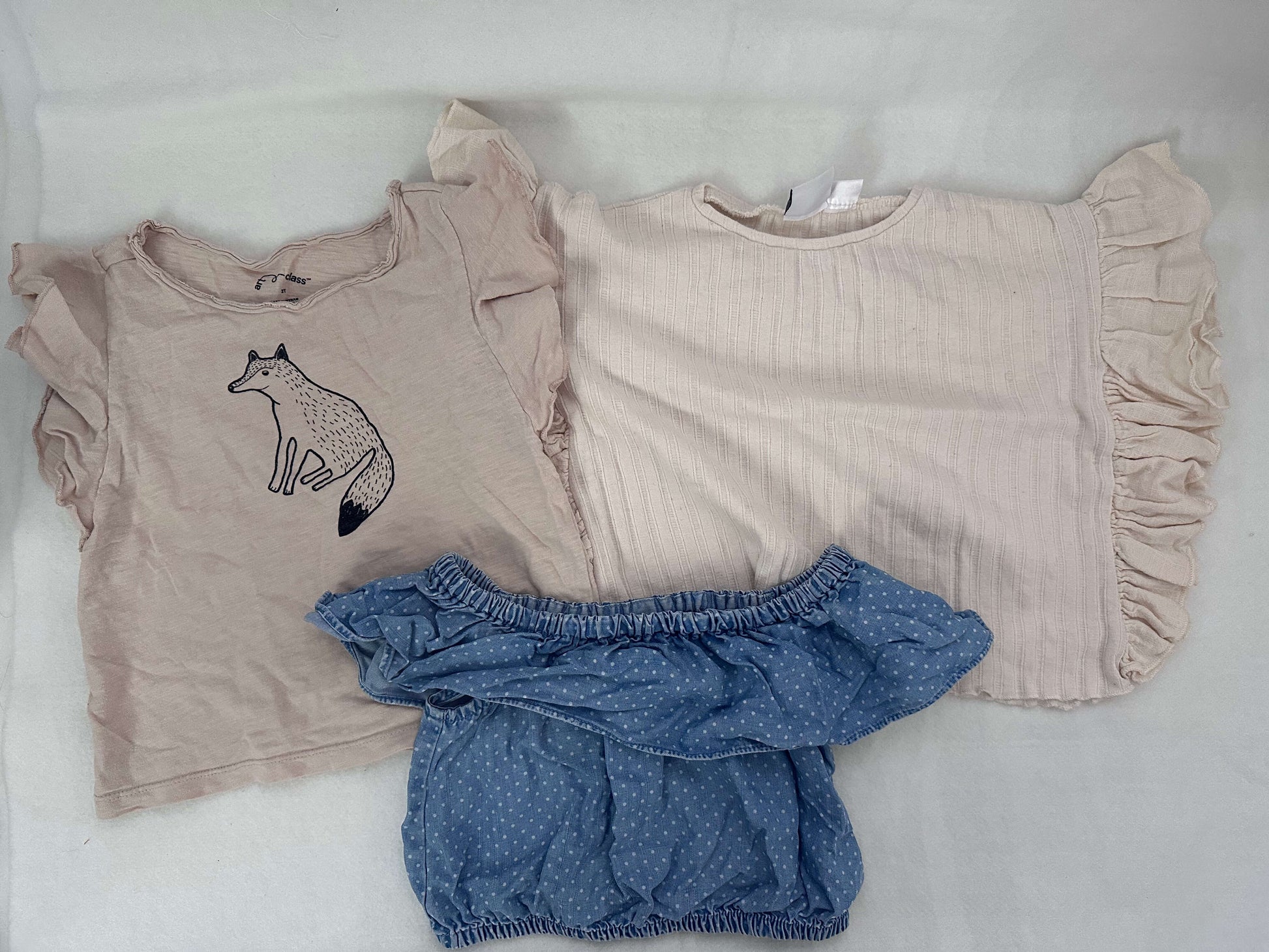 Description : 2/3T Gymboree chambray, art class fox top, Zara flutter sleeve. Delicate washed on cold, hung to dry.